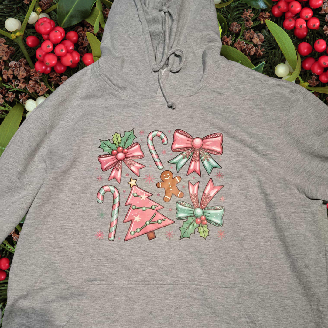 Avec ses tons pastel, ses nœuds scintillants illustrés, ses cannes de bonbon, son petit bonhomme en pain d’épice et son sapin rose festif, ce hoodie apporte une ambiance adorable et chaleureuse à toute ta saison de Noël.